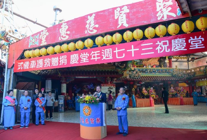 桃園市長鄭文燦(1)日上午前往大溪區聚賢慈惠堂,出席「聚賢慈惠堂慶祝37週年堂慶捐贈救護車儀式」時表示,聚賢慈惠堂創建於民國71年,勵行濟世、勸世、救世三大宗旨,香火興旺,信徒滿天下,是地方信仰中心,為慶祝37週年堂慶,今日集結信眾的愛心捐贈「聚賢號」救護車予市府消防局大溪分隊,期盼發揚母娘慈悲精神,提升大溪區救護能量,照顧更多偏鄉居民的健康,並祈求母娘保佑市民朋友闔家平安,桃園建設大發展。