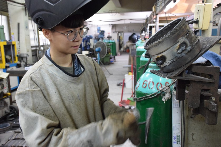 因為是全班唯一的女生,剛開始上課時,林品均常招來男同學異樣眼光甚至還被詢問「為何會來選這行?」時間一久,男同學不僅會主動幫她忙,還會教她如何銲接才能銲得漂亮;林品均說,剛開始練習時,常常被銲渣燙傷,手上腳上都是傷口,再被燙了10多次之後,她才慢慢掌握了「手要穩、心要細、專注力要夠,還有全副武裝防護」的秘訣,訓練也漸入佳境,越銲越有心得!她還說,大學都是學科,很少有實作課程,參加職訓之後,因為有興趣,反而比在大學讀書還認真學習。