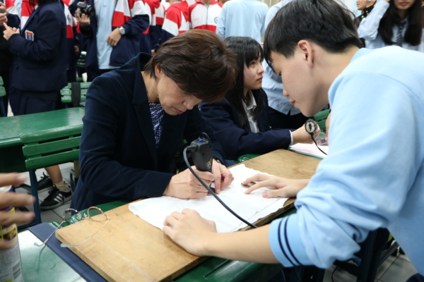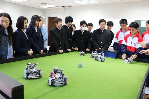 六和高中各班級也把專業的課程特色融入交流活動,如機201班用機電工具「中心衝」與電刻筆製作金屬塊刻畫,讓日本同學體驗電刻的製作,圓形金屬塊上還有機201同學刻上的台灣圖騰與六和LH的字樣,充滿紀念意義。資101班則結合資訊科專業課程,安排自動足球機器人對決大賽,操作學生自製的遙控夾娃娃機、還有體感天車等操作課程,與日本同學進行資訊專業課程的交流。