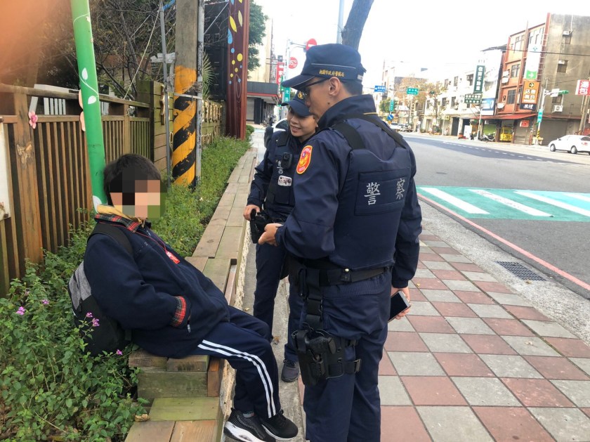所幸員警蕭建昌、吳曉玲及黃楚桓巡邏經過平鎮區延平路,發現人行道的長椅上躺著一名身穿運動服的男童,蜷著身子凍的不斷發抖,員警見狀趕緊上前喚醒男童,只是男童支吾其詞、語焉不詳,對於姓名、家裡電話及地址都沒辦法表達,只嚷嚷著要去學校,且情緒越來越激動,於是員警立即協助安撫,並將男童帶返駐地,提供熱飲讓其稍作休息。