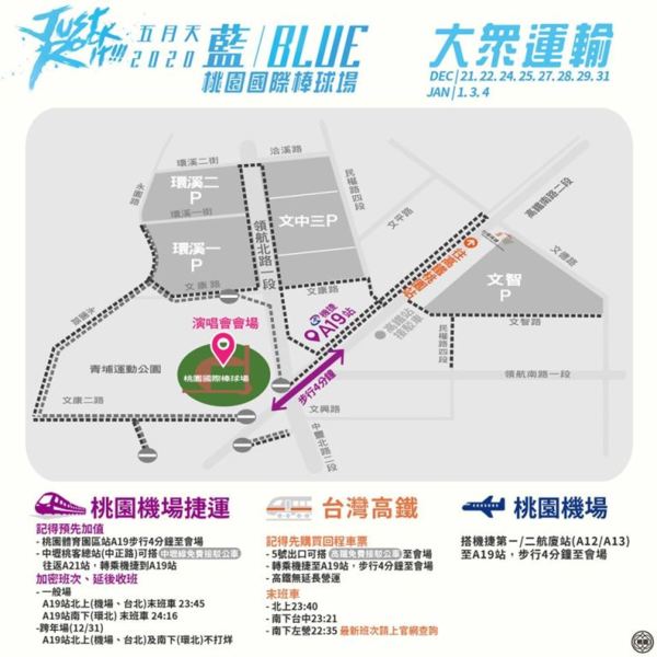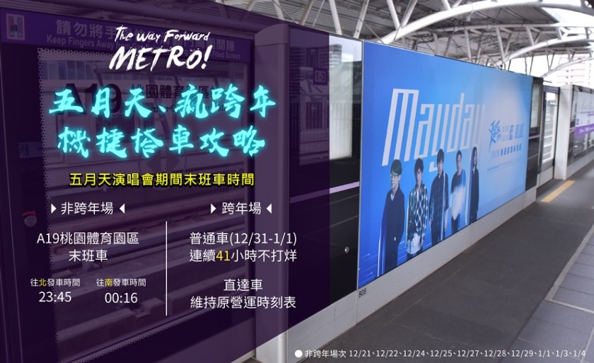 五迷們~~Are you ready?!五月天「Just Rock It!! 藍/Blue」巡迴演唱會(21) 日於桃園國際棒球場搖滾開唱,上萬粉絲準備High整晚!為了服務演唱會期間的廣大歌迷,桃園捷運於散場期間加密班次、延後收班疏散人潮,更於12/31 跨年夜連續41小時不打烊。桃捷公司(21)日貼心製作搭車攻略,讓看五月天演唱會以及跨年晚會的粉絲們,快樂出門,平安回家。