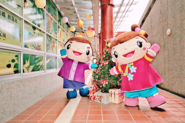 桃園市客家文化館去年以紙傘、花布元素推出全台第一棵客家風聖誕樹,成為桃園熱門聖誕打卡景點,今年從傳統元素走向創新風格,特別使用客文館獨家文創設計「客家布馬舞花布」,創新製作客家風聖誕裝飾,以花布蝴蝶結、ㄚ弟ㄚ妹抱枕及布馬舞禮物盒妝點聖誕廊道,跳脫大家對於傳統花布的應用及想像,也讓民眾看見耳目一新的客家風聖誕樹。