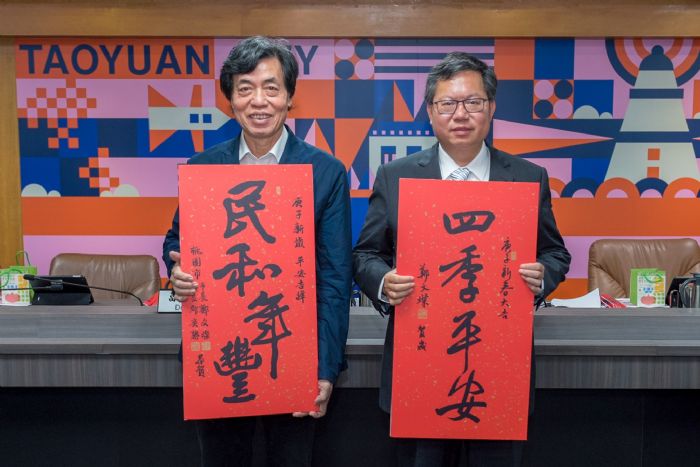桃園市長鄭文燦(25)日在市政會議上發表「2020(庚子年)春聯」時表示,桃園打破依循生肖題字的傳統,2020(庚子年)春聯邀請朱振南、鄧君浩兩位書法名家揮毫「民和年豐」及「四季平安」兩幅春聯,其中「民和年豐」取自《左傳.桓公六年》,希望人民在無災無難下安居樂業、年年有餘;「四季平安」則祝福台灣,在新的一年平安喜樂。2020(庚子年)春聯將於12月30日開始發送,市長與議長聯名版的「民和年豐」春聯,將透過區公所及區里系統發送;市長署名的「四季平安」限量版春聯,民眾則可至市政府1樓服務台及各區公所服務台索取。