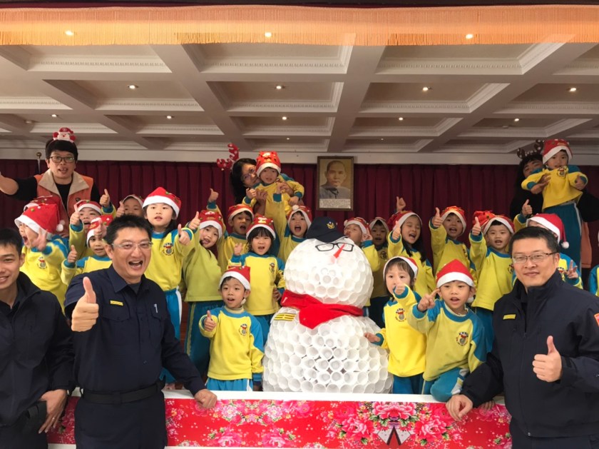小天使們除了吟唱祝福詩歌、帶來自編舞蹈外,也齊心協力利用環保紙杯做了一個大雪人送給平鎮警分局,幫辛苦執行選舉專案勤務的波麗士們加油打氣,看著小天使們可愛的模樣,也讓辛苦執勤的警察同仁們,瞬間忘了辛勞。