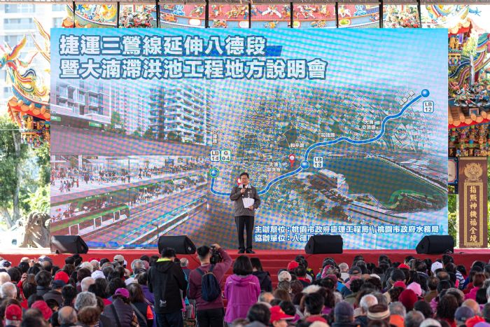 桃園市長鄭文燦(28)日上午前往八德區指玄宮,出席「八德區捷運三鶯線延伸八德段暨大湳滯洪池工程」說明會時表示,八德區捷運三鶯線延伸八德段的可行性研究已獲國發會同意支持,捷運局正積極進行綜合規劃作業,以117年完工通車為目標;水務局則為改善八德區和平路及和強路等地的淹水問題,推動「大湳滯洪池工程」,預計明(109)年2月開工,111年底完工,市府將持續建設八德軌道及水利工程,提升八德區生活品質。