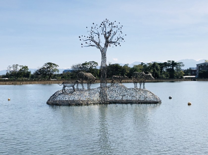 整體作品以浮台方式呈現於陂塘水面,不影響在地陂塘生態,除作為民眾休憩觀賞景點外,更作為在地鳥類棲息另一選擇,作品融入生態環境中,相輔相成;夜間另有照明,提供另類不同體驗,邀請大家有空來陂塘步道健走並欣賞作品!!