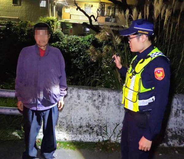 大園警分局新坡派出所所長傅錫華、姜彣勳於6日凌晨1時許,巡邏行經忠富路一處水圳旁,發現一名老翁虛弱地坐在路邊,員警見狀上前關心,但因老翁沒有攜帶證件無法查詢身分,且有失智及重聽症狀,導致雙方在溝通上一度遇到瓶頸,
