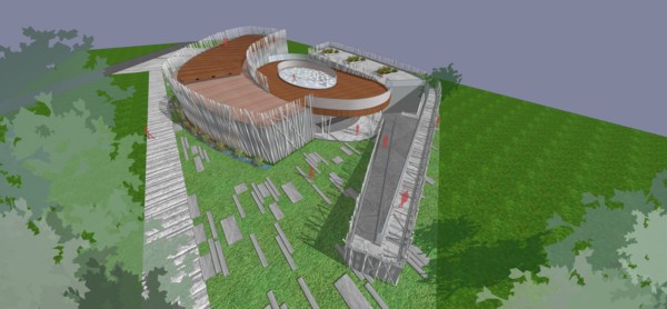羅區長接著說明,本案基地座落於公園用地內,規劃設計團隊考量該座活動中心未來將具有公共與開放的特性,不但可提供各個團體使用,又同時與社區居民日常生活緊密相連。因此,本工程建築規劃以『尊重自然順應自然』的設計主軸,建築物空間架構以較為流線型的形體去呼應大自然的環境,廣納四方民眾進入的概念也能提高建築的友善度。從建築內部望出去的景觀能因應基地不同區域的植生及活動,使視覺感受更多元。頂層廣場不同高度及角度的變化,讓市民朋友在此駐留時,可以感受到空間的變化,欣賞公園周遭的綠意盎然,獲得片刻的寧靜。