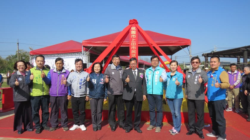 楊梅區公所9日上午於和平森林公園舉辦「楊梅區上田市民活動中心」開工動土典禮,桃園市長鄭文燦、民政局主秘陳茹文、市議員李家興、周玉琴、涂權吉、鄭淑方、楊梅區長羅國裕、立法委員參選人黃世杰、上田里溫福明里長及鄰近里長皆到場參與,場面熱鬧溫馨。