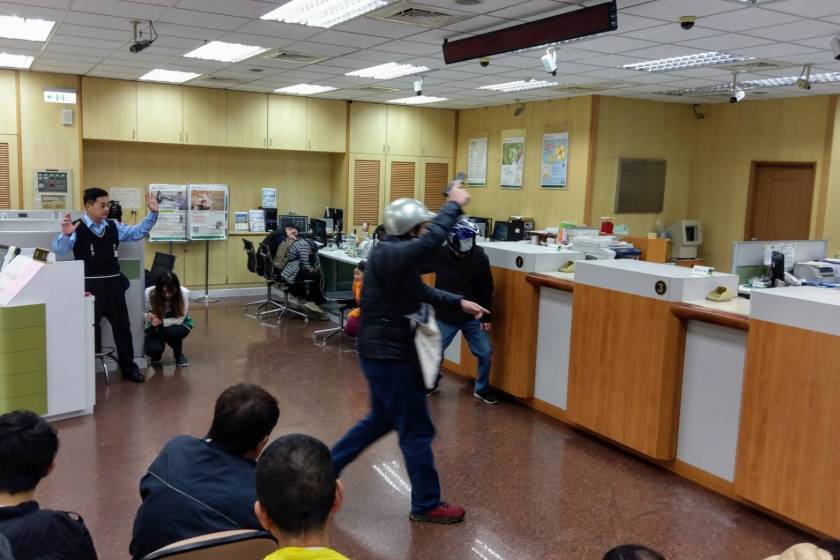 警方表示,此次演練是模擬2名歹徒騎乘一輛機車,於銀行外觀察內部情形,趁行員忙碌、疏於防範之際,闖入對空鳴槍喝令行員交出現金,行員先將鈔票丟出來爭取時間,並趁機按下警鈴報警。