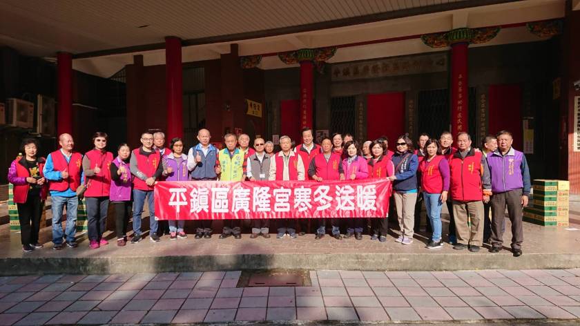 桃園市平鎮區廣隆宮管理委員會為幫助弱勢族群,讓低收入戶過個好年,15日上午在該宮舉辦「寒冬送暖展愛心」活動,由主任委員宋梅照、總幹事李煥榮及平鎮副區長鄭錦文共同主持發送儀式。平鎮區公所社會課長徐國勳、立委呂玉玲、市議員陳萬得、里長李文俊、農會前理事長劉兆青等蒞臨關懷共同參與。