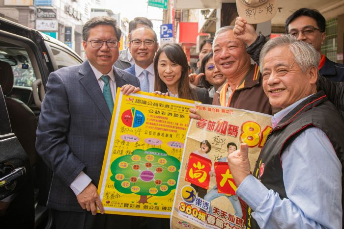 桃園市長鄭文燦(16)日上午前往中壢區福得彩券行,出席「桃園市109年春節公益彩券促銷宣導活動」時表示,公益彩券盈餘是地方政府推動社會福利的重要經費來源之一,購買彩券不但有機會中獎圓夢,同時也能幫助許多弱勢族群,讓社會更進步、更公平美好。請民眾把握春節彩券加碼的好機會,一起買彩券、做公益,祝福市民朋友鼠來運轉,新春好兆頭,也預祝台彩買氣滿滿,大獎落腳桃園。