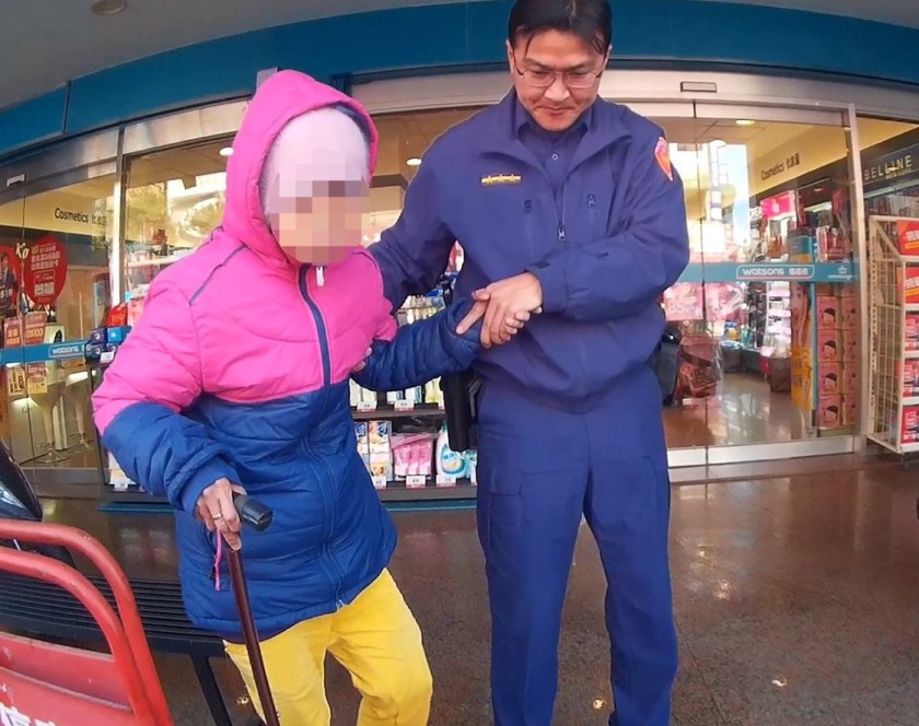 老婦因在外行走一上午,體力耗盡,加上不知該如何返家,一人孤單且無助的拄著拐杖於路旁,警方見即趨前關心,老婦初始十分恐慌,但經警方多番安撫後情緒逐漸平穩,隨即協助攙扶上警車,載其返派出所並提供老婦熱飲及點心以補充體力,同時連繫其家人前往帶回,老婦之兒在得知警方已找到其母親時,情緒十分激動並立即至所,母子一見面後便喜極而泣地相擁。