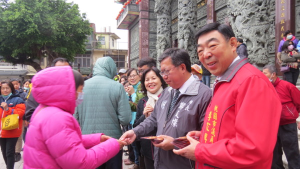 桃園市長鄭文燦29日上午前往楊梅區奉天宮、錫福宮、頭重溪三元宮、啟明宮參香,並發送新春福袋給市民朋友,鄭市長祈求三個願意,第一,希望台灣人健康、平安,中國武漢肺炎疫情不再擴散;第二,保佑楊梅大建設、大發展;第三,祝福每位市民朋友心裡的願望只要努力都能實現。