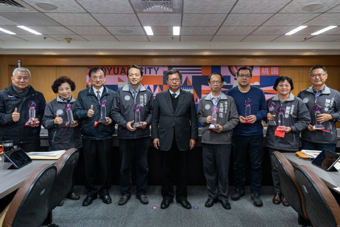 桃園市長鄭文燦5日上午主持市政會議,頒發「108年桃園市政府金桃獎」,鄭市長表示,市府性別平等辦公室為鼓勵同仁發揮創意,並於業務中融入性別平等,規劃辦理第一屆「108年桃園市政府金桃獎」,共有「性別平等創新獎」、「性別平等故事獎」、「性別平等最佳團隊獎」及「性別平等最佳推手獎」4個獎項。本府各機關踴躍參與角逐,總計提報53案,最終由民政局、環保局、地政局、勞動局、工務局、社會局、教育局、財政局、平鎮區公所、龜山區公所、蘆竹區公所、觀音區公所、中壢區公所、大溪區公所共14個機關獲得金桃獎殊榮,值得嘉勉肯定。鄭市長期許各機關持續推動創新作為,將性別平等意涵融入本府各項政策、法案、計畫、措施等業務中,打造桃園為性別友善及永續發展之宜居城市。