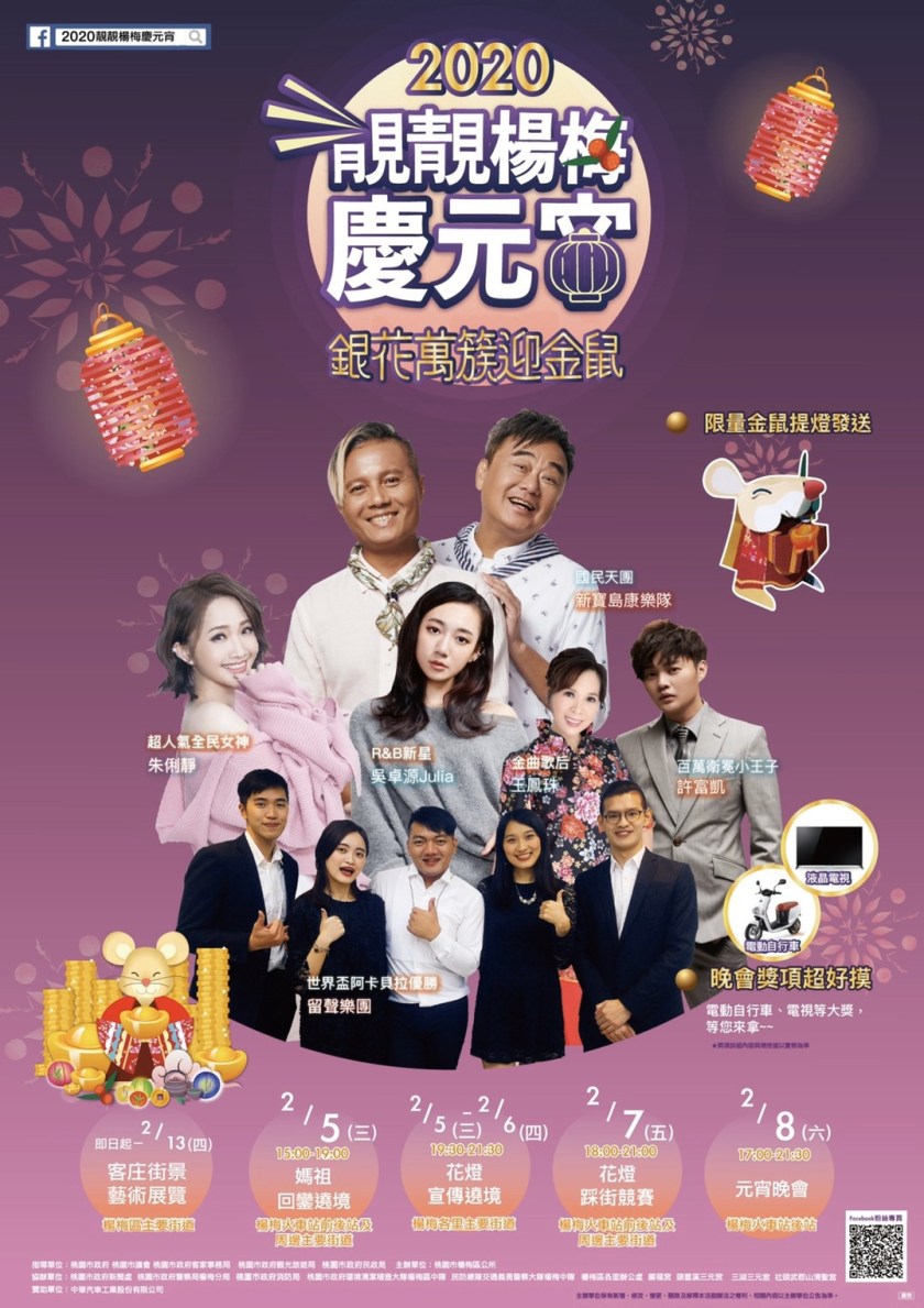 元宵晚會在2月8日下午5點於楊梅火車站後站盛大展開,超強卡司的演出組合,國民天團新寶島康樂隊陳昇、R&B新星Julia吳卓源、全民女神朱俐靜、百萬衛冕小王子許富凱、世界盃阿卡貝拉優勝留聲樂團等一同與民眾熱鬧慶元宵。