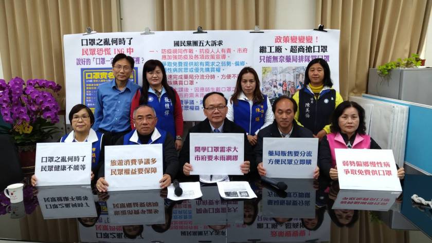 針對最近民眾大排長龍搶買口罩亂象,桃園市議會國民黨團10日召開「口罩之亂何時了、民眾健康不能等」記者會,黨團議員砲轟政府口罩政策荒腔走板,沒有統一標準,造成民眾無所適從,黨團提出免費提供口罩給弱勢、偏鄉、慢性病民眾共五大訴求,希望政府不要自亂陣腳,造成恐慌。