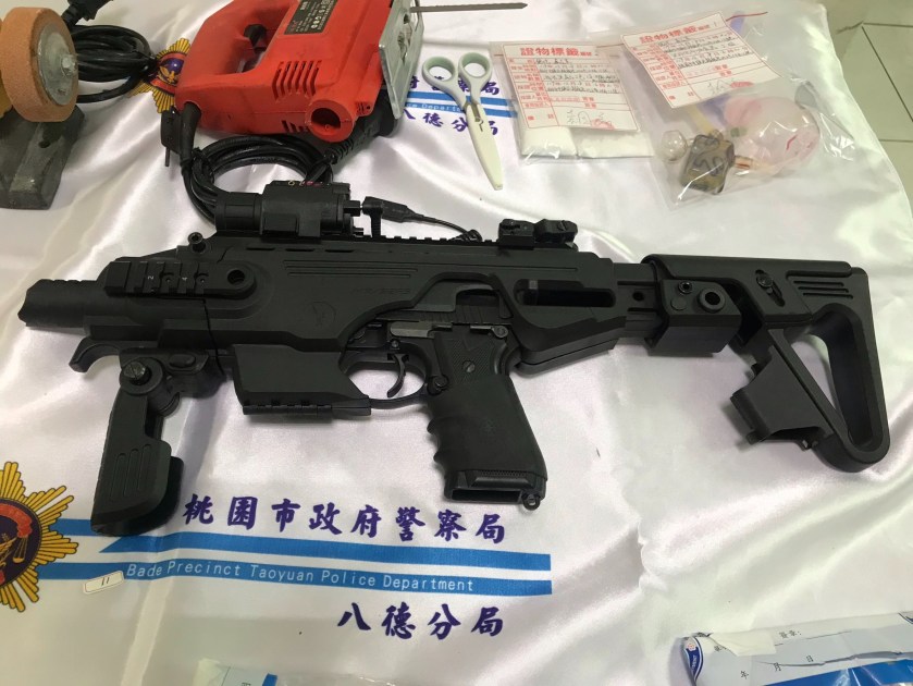 八德分局日前接獲線報,中壢區袁姓男子擁槍自重,經由偵查隊及四維所共組專案小組進行監控,報請桃園地檢署列股劉檢察官指揮並向桃園地方法院聲請核發搜索票,專案小組經數日監控後見時機成熟,會同中壢及平鎮分局員警執行攻堅,於8日分別於中壢區金鋒四街查獲袁男持有槍枝及毒品。