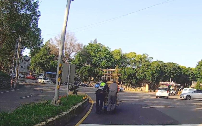 龍潭分局石門派出所警員徐松佞及陳欣妤等2員,於109年2月12日中午13時許執行巡邏勤務,行經龍潭區中正路佳安段上坡路段時,忽見一名老翁推著載滿廢鐵及廢紙箱的推車,突然在路中不動,當下行經車輛見狀均紛紛閃避,員警考量該路段鄰近石門水庫風景區,平時車輛往返頻繁,警方為顧及老翁及其他用路人安全,立即在後警戒以防止其他危險發生。