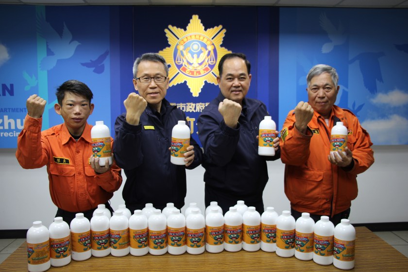 這位熱心的朱嘉裕先生,現年39歲,從事雞蛋批發生意,而且還是桃園市民防總隊交通義勇警察大隊蘆竹中隊的隊員,其父親與兄長也都是中隊成員。一門三傑,工作之餘,平時即熱衷於地方公益事務。而朱先生有感於這次病疫流行,警察人員基於職責,必須活動於公眾間服務,且辦公廳舍接受民眾報案不舍晝夜,廳舍環境衛生的維護工作,就顯得格外重要。因此,朱先生跑遍了多處門市,在這個時機好不容易購足了28瓶的滅菌液,要提供給蘆竹分局清潔防疫之用。