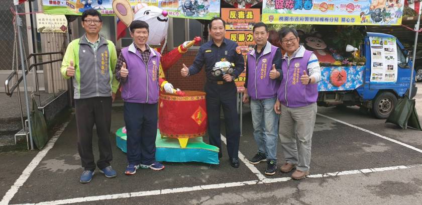 楊梅分局分局長林信雄也致贈警察公仔,感謝上湖里張花樑里長、三湖里鄧敦仁里長、瑞原里葉佐陸里長、頭湖里郝文會里長協助花燈佈置指導。