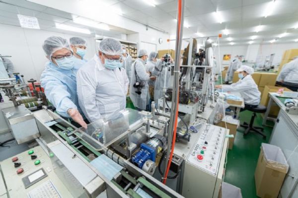 桃園市長鄭文燦18日上午前往龜山區,視察易廷企業工廠口罩增產情形時表示,易廷企業目前每日口罩生產量約22萬片,經濟部提供2組新機台預計3月初加入產線,屆時日產能可達40萬片,讓國內防疫物資更充足;易廷企業也捐贈成人防塵口罩5萬片、兒童防塵口罩5萬400片,後續由市府統籌分配給第一線機關,鄭市長代表市民感謝易廷企業對政府防疫工作所做出的貢獻。