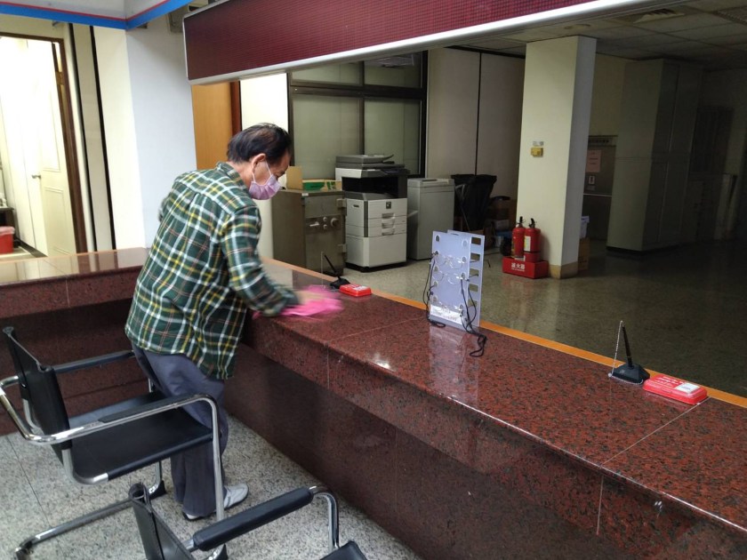 為因應新冠肺炎疫情,桃園監理站要求第一線服務人員均配帶口罩執行業務,並於出入口處張貼防疫海報告知民眾防疫期間應注意事項。另本站服務台、初考領教室、汽機車登檢窗口等處皆放置酒精清潔液供民眾使用。本站清潔人員也定時使用稀釋漂白水清潔服務臺、辦件櫃臺、電梯按鈕、廁所等公共區域,全力作好防疫工作!