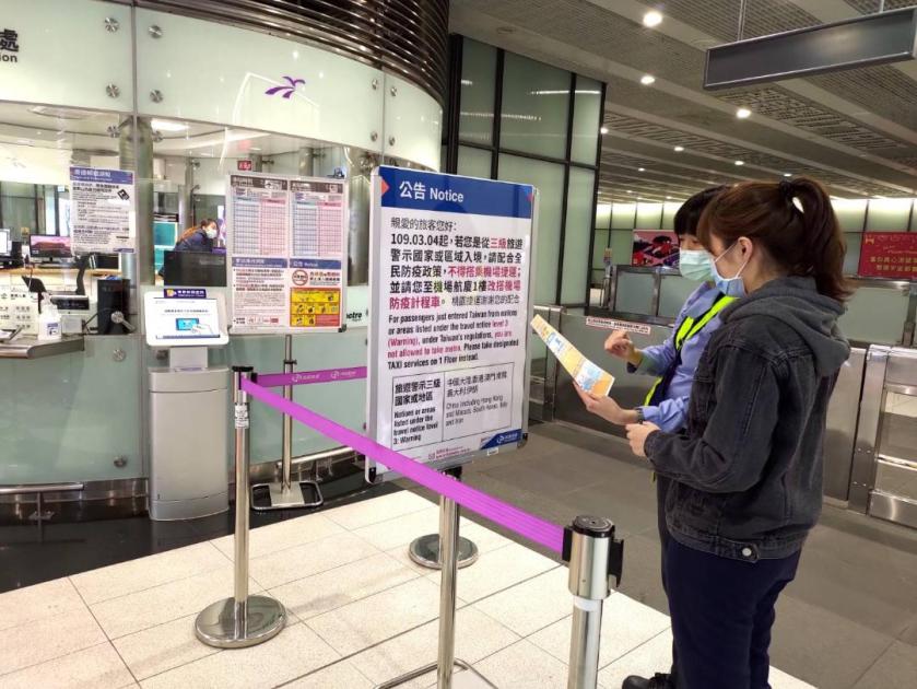 1.於A12(機場第一航廈站)及A13(機場第二航廈站)車站入口處,放置告示立牌,公告並要求從三級旅遊警示國家旅客不得搭乘大眾運輸工具。