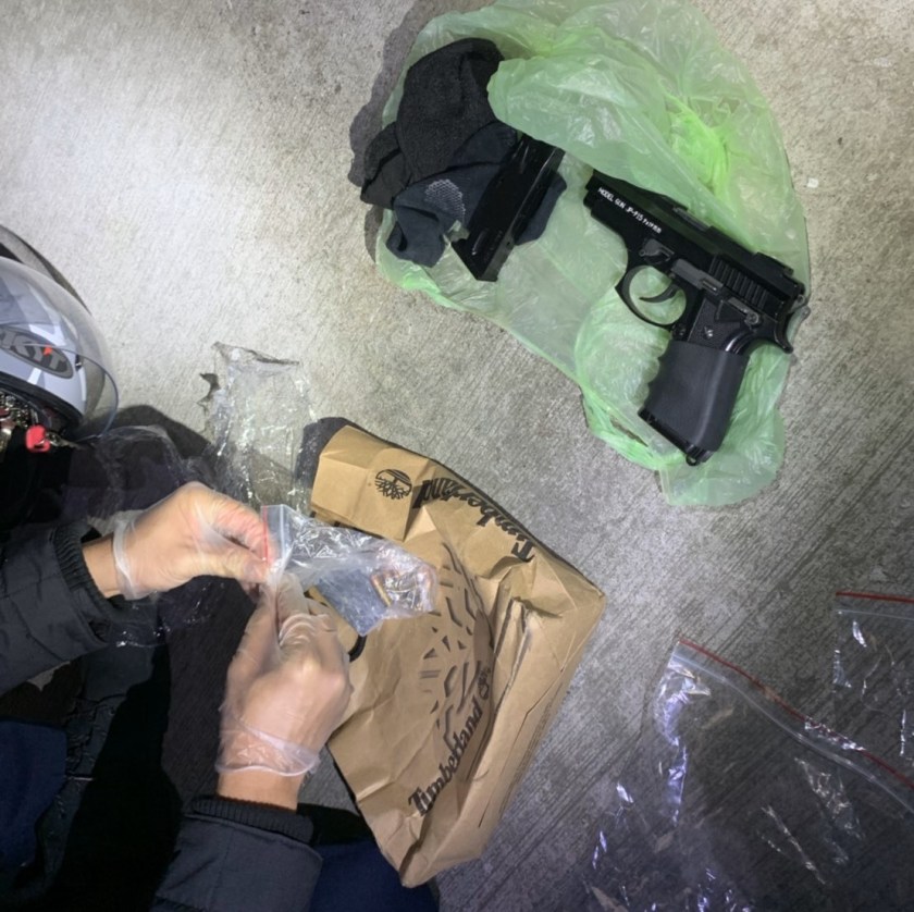 八德分局偵查隊長沈介茗說,警方將章男當場逮捕,在章男所騎乘的重機車車廂內查獲改造手槍1把、改造子彈47發、海洛因3包(53餘公克)、安非他命(42餘公克),章男自知難逃法網,仍辯稱不知因槍砲案遭通緝,遭警查緝只得乖乖就範束手就擒。