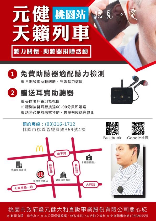 凡設籍桃園市,年滿18歲的民眾,測得聽力損失達60至90分貝者,可免費領取多功能助聽器1台,限量500台,有需求的民眾可至元健大和直販公司桃園經國店辦理(桃園市桃園區經國路369號4樓),洽詢專線03-3161712。
