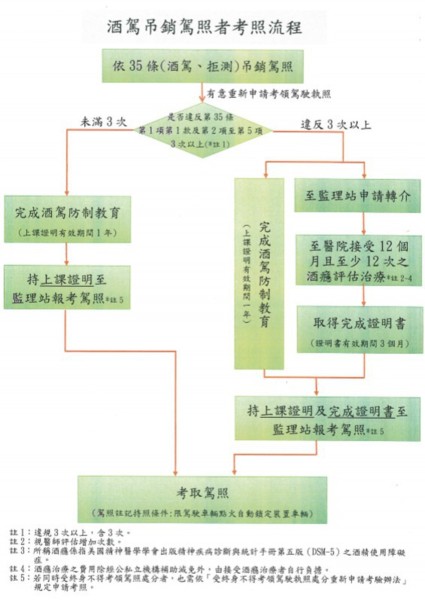 自109年3月1日起,凡是違反處罰條例第35條第1項第1款及第2項至第5項酒駕吊銷之民眾,酒駕吊銷次數(終生累積未滿3次)且有意重新申請考領駕駛執照者,需自行至各監理所報名參加15小時酒駕防制教育課程完成後,持上課證明至監理站報考駕照;倘酒駕吊銷次數(終生累積滿3次,含3次以上)者,則需先至各衛生局指定酒癮治療機構接受12個月且至少12次之酒癮評估治療及各監理所完成酒駕防制教育課程後,持酒癮治療結業證書及上課證明,始可至監理站重新報考駕照。