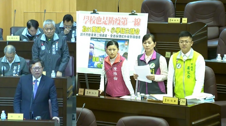 陳雅倫議員、黃家齊議員及鄭淑方議員共同關心桃園各級學校防疫物資,包括熱顯像儀、額溫槍、口罩、酒精等資源整備及分配情形,盼市府落實盤點,並以公平原則進行分配。對此,鄭市長表示,學生在家、入校及離校時皆需量測體溫,目前因市場缺貨,桃園各級學校額(耳)溫槍為2個班級共用1支,稍嫌不足,市府將增購5,000支額(耳)溫槍,調查各級學校資源後,依需求分配額(耳)溫槍供學校使用,達每班都能夠配到1支為目標。