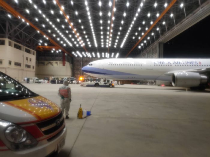 在防護部分,詹處長強調,此次出勤同仁皆依標準作業流程進行,並以最高標準防護,各配有N95口罩、連身型防護衣、鞋套、護目鏡及手套等裝備,日前後送鑽石公主號包機乘客任務,也是同樣的規格,這次再完成使命,累積經驗值,相信將建立防疫處置典範。