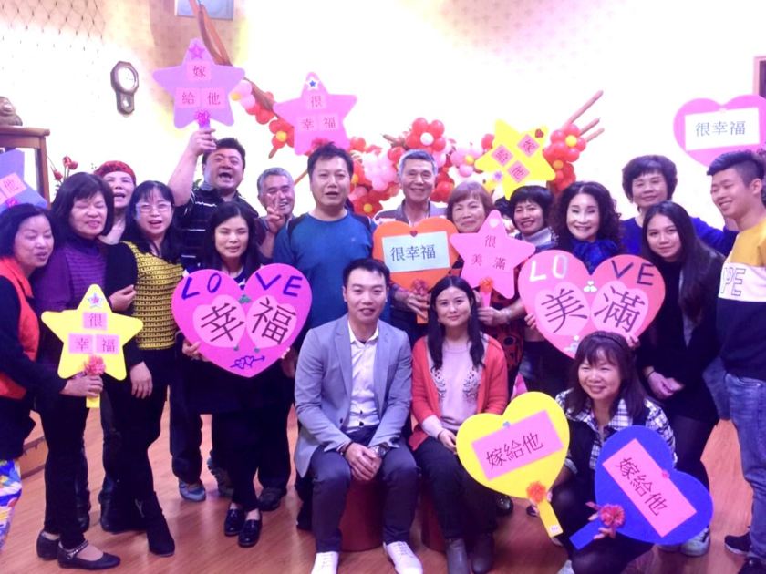新屋區一家知名鵝肉店的少東郭瀚文,在美滿服務中心認識楊梅怡仁醫院任職的馮琬媛,訂婚時還不忘舉起「美滿」的祝福。