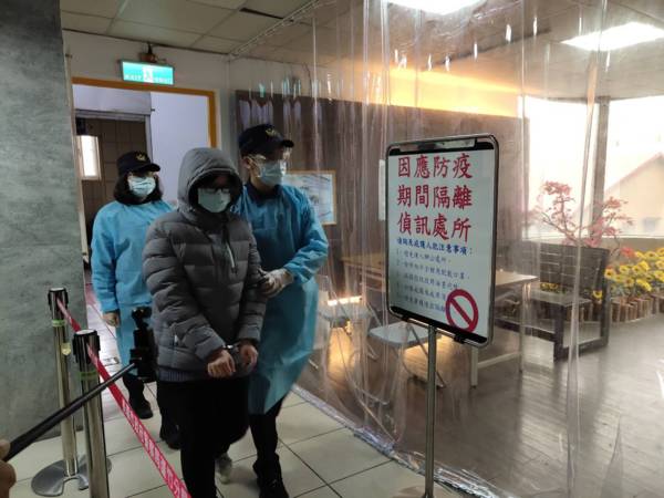 蘆竹分局偵查隊辦公廳大門旁在防疫期間也設置了一處「因應防疫期間隔離偵詢處所」,讓員警在偵辦案件與對方有面對面需要時,有一隔離幕實體阻隔,以充份保護安全。