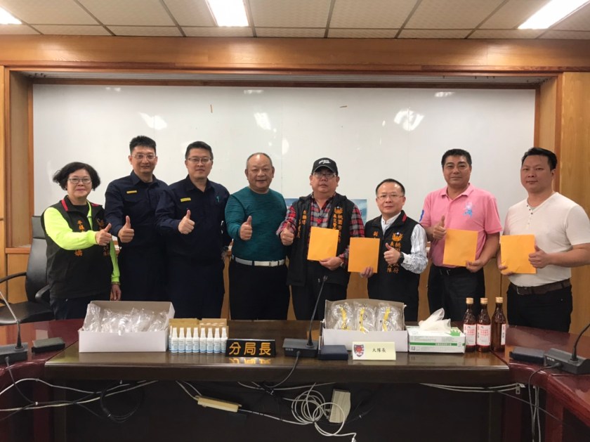 平鎮警分局分局長李建民表示,桃園市義勇交通警察大隊大隊長呂學祺,平時熱心公益,有感於近期武漢肺炎疫情防疫需求,特邀地方仕紳周國福副大隊長、呂豐義總顧問、許崇溥副總顧問、李承晉顧問、陳宏如顧問,共襄盛舉,一同捐贈抗菌液、酒精、護目鏡、拋棄式手套給第一線防疫人員,以提升警察同仁的自我防疫能力。