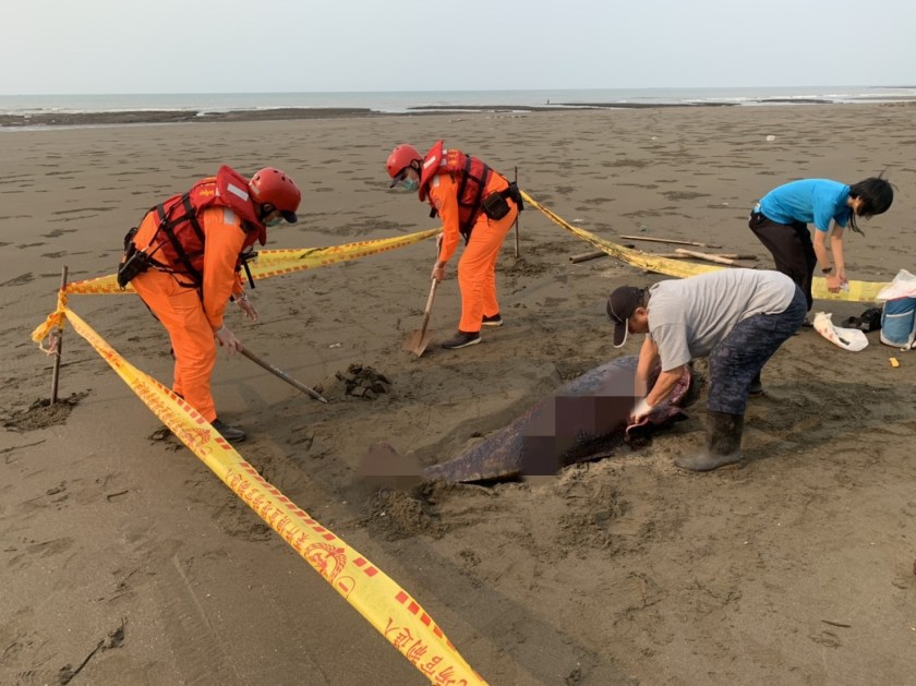 海巡署北部分署第三巡防區20日18時20分許接獲118轉民眾電話通報,於桃園市觀音區白玉沙灘岸際發現1隻死亡鯨豚,立即通報第八岸巡隊協處。