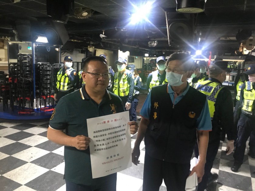 桃園市政府中壢警分局於3月25日晚間實施擴大臨檢,警方表示為落實政府防疫政策,本次勤務為針對轄內KTV、酒店、夜店、外籍移工舞廳加強道德勸說並宣導社會責任,讓前述娛樂場所業者在目前非常時期能夠願意自主暫停營業14日,讓民眾群聚感染機會降到最低。中壢警方表示,目前中壢地區計有1間夜店、2間外籍移工舞廳及3間酒店,共6間娛樂場所業者願意配合政府防疫政策自主停業14日。