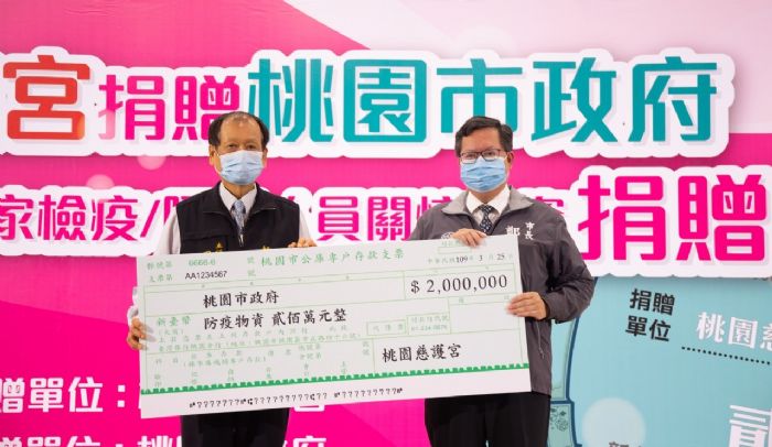 桃園市長鄭文燦31日上午於桃園市政府綜合會議廳,出席「桃園慈護宮捐贈桃園市政府防疫基金暨居家隔離人員關懷物資捐贈記者會」。鄭市長感謝桃園慈護宮捐贈200萬元防疫基金,以及3萬瓶75%酒精隨身瓶供市府統籌運用,市府將善用這些資源,包括購買防疫物資,或是給予防疫人員實質的鼓勵等,讓防疫工作做得更好;鄭市長也祈求媽祖保佑疫情趕快退燒,政府也將持續落實高標準防疫工作,阻絕所有可能的防疫破口。