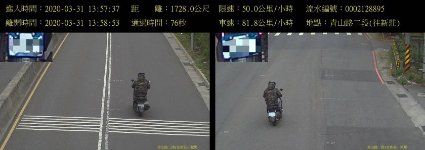 二、龜山區青山路二段(往新莊),重機車騎士經測得1728公尺距離通過秒數為76秒,換算時速高達81.8公里,超出該路段速限規定的速限50公里,超速31.8公里。