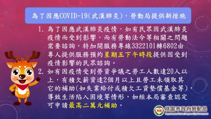 桃園政府勞動局為保障勞工權益,並因應武漢肺炎疫情所帶來之衝擊,如有民眾因武漢肺炎疫情而受到影響,而有勞動法令等相關之問題需要諮詢,除於星期一下午及星期三下午時段外,特加開服務專線3322101轉6802由專人提供服務預約星期五下午時段提供因受到疫情影響的民眾諮詢,以解決因疫情所生之相關法律疑義,以保障其權益。