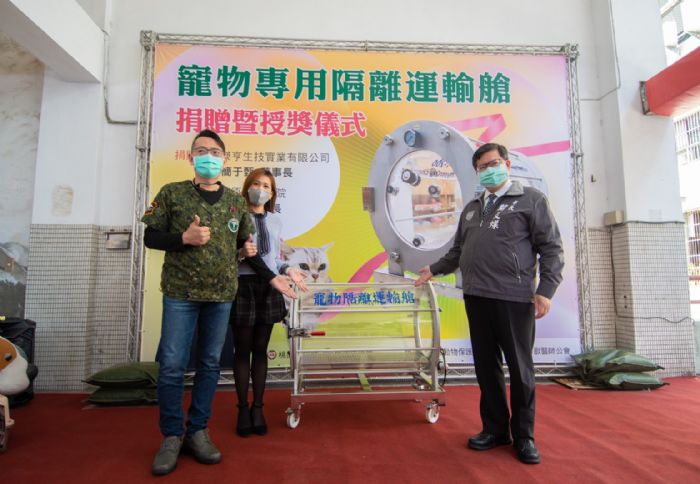 桃園市長鄭文燦(16)日上午前往市府動物保護處,出席「防疫物資─寵物專用隔離運輸艙捐贈暨授獎儀式」時表示,感謝傑亨生技公司及中原動物醫院,發揮「防疫有責、獸醫有愛」的精神,捐贈價值30萬,專利設計的寵物專用隔離運輸艙,其純氧艙的運送裝置能安全隔離,避免運輸過程中發生動物交叉污染或脫逃等風險,保障第一線動物管制人員健康,其艙體的設計也能讓寵物穩定,維護動物福利,感謝民間攜手完善動保防疫工作。