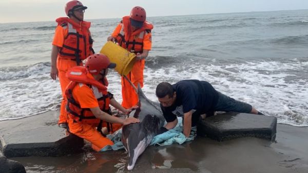 海巡署北部分署第八岸巡隊1日1435時,接獲民眾鄭先生電話通報,於桃園市大園區潮音海風車岸際發現1隻擱淺海豚,請海巡署前往處置。