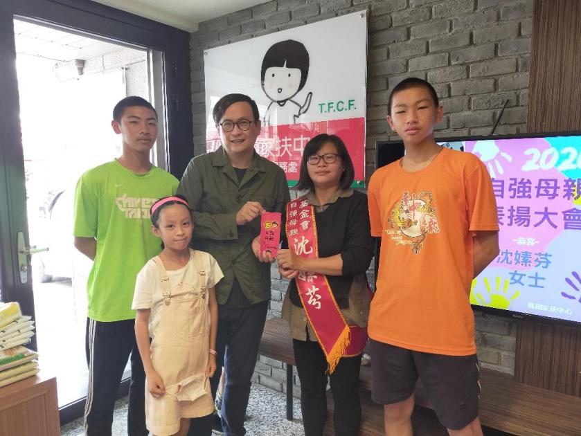 桃園家扶中心推薦的全國自強母親-沈嫊芬,為了家庭付出辛勞也無怨言的女人,堅忍不拔的態度與精神值得表揚與鼓勵。上天的忌妒嫊芬原本有個美滿的家庭,即使嫊芬與丈夫相差10歲,嫊芬的爸爸非常支持兩人結為連理。嫊芬結婚時相當年輕,因此高中休學投入婚姻生活。婚後有疼愛她的先生,壯得像大樹的丈夫是他的靠山,也育有三子,但可能是因過於幸福招來上天的忌妒,丈夫罹患鼻咽癌、接連生意被倒債及住家被法拍。面臨無家可歸的窘境、丈夫重病、孩子尚年幼,嫊芬在這種惡劣情況下,沒有選擇逃離,反而一肩扛起照顧丈夫、孩子及家庭經濟重擔。