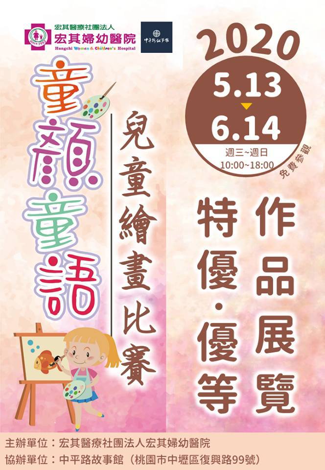 今年初宏其婦幼醫院舉辦的童顏童語兒童繪畫比賽意外獲得熱烈迴響,主辦單位特別邀請中平路故事館(中壢區復興路99號)協辦展出比賽優勝作品,畫展期間自5月13日起至6月14日止為期一個月。展出本次宏其婦幼醫院童顏童語兒童繪畫比賽特優、優等共六幅優秀的作品。
