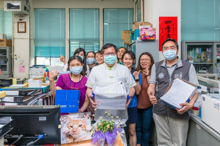 桃園市長鄭文燦10日上午,在八德區長邱瑞朝、中壢區長吳宏國分別陪同下,前往八德、中壢區公所,慰勞急難紓困案件加班同仁時表示,感謝同仁犧牲母親節假期,利用假日趕工審核申請案件,讓民眾能盡快收到紓困金,感謝他們的辛勞,也祝福女性同仁母親節快樂。