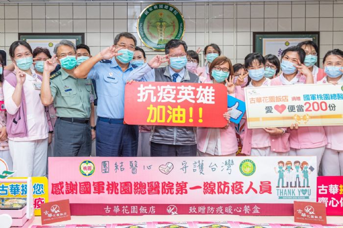 桃園市長鄭文燦15日中午前往國軍桃園總醫院,出席「古華花園飯店200個暖心防疫餐盒致贈國軍桃園總醫院儀式」時表示,感謝古華花園飯店秉持社會回饋與關懷的理念,與市府共同合作「力挺醫護英雄」公益計畫,致贈桃園總醫院200個特製愛心便當,並推出醫護優惠專案,蛋糕或麵包買一送一,表達對醫護英雄們日夜辛勞的感謝,為第一線防疫英雄加油打氣。