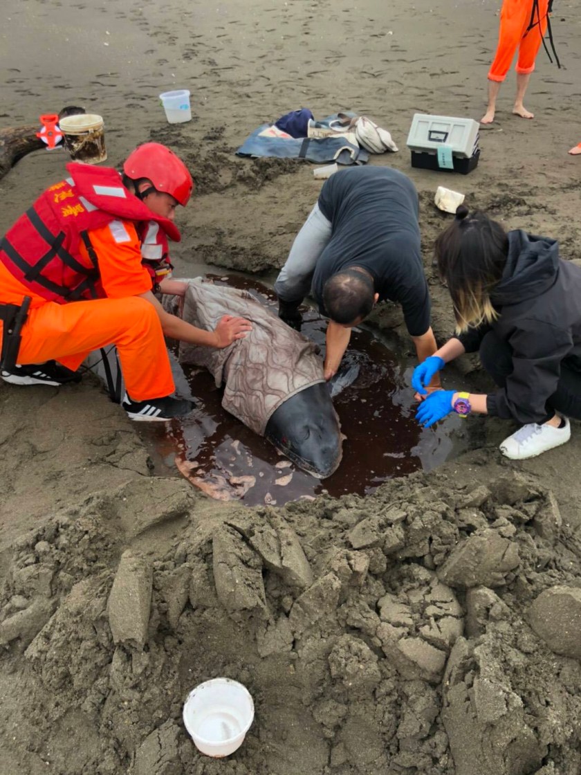 第八岸巡隊立即派遣永安安檢所及巡邏人員前往現場,並聯繫中華鯨豚協會及桃園市政府海岸管理工程處生態保育科協處,1120時海巡人員及海管處人員陸續抵達現場,因鯨豚擱淺位置距海岸線較遠,無法將鯨豚推回大海,隨即以涼被及海水持續為鯨豚淋水保濕,並在鯨豚周圍挖溝,以利鯨豚救護,1330時中華鯨豚協會抵達現場,判斷該鯨豚為保育類「小抹香鯨」(長200公分,寬50公分),多處受傷需移送救治,將後送八斗子漁港鯨豚協會救援池治療。