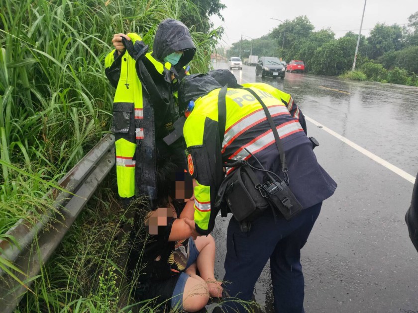 沒想到婦人就這樣淋著雨,邊走邊哭,因婦人身上沒有攜帶皮包及手機,加上體力不支,只能蹲坐路旁不斷哭泣,員警巡邏經過發現,立即上前關心,並用雨衣為婦人遮雨,婦人見到員警時,也不斷訴說著心中的委屈,臉上已分不出是雨水還是淚水。