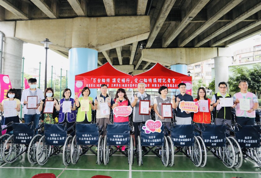 桃園市圓夢愛心關懷協會與財團法人公益傳播基金會於6月9日上午9:30在桃園區龍安街段羽球場聯合舉辦「百台輪椅 讓愛暢行」輪椅捐贈儀式,為落實照顧弱勢團體,匯集衆人愛的力量,總共準備了150台輪椅,給予身障族群幫助及關懷,進而改善生活的便利及品質。指導單位:桃園市政府;協辦單位:桃園市桃花源青年領袖協會、桃園市龍岡社區發展協會、桃園區龍鳳里辦公處、桃園區龍鳳里環保志工隊。
